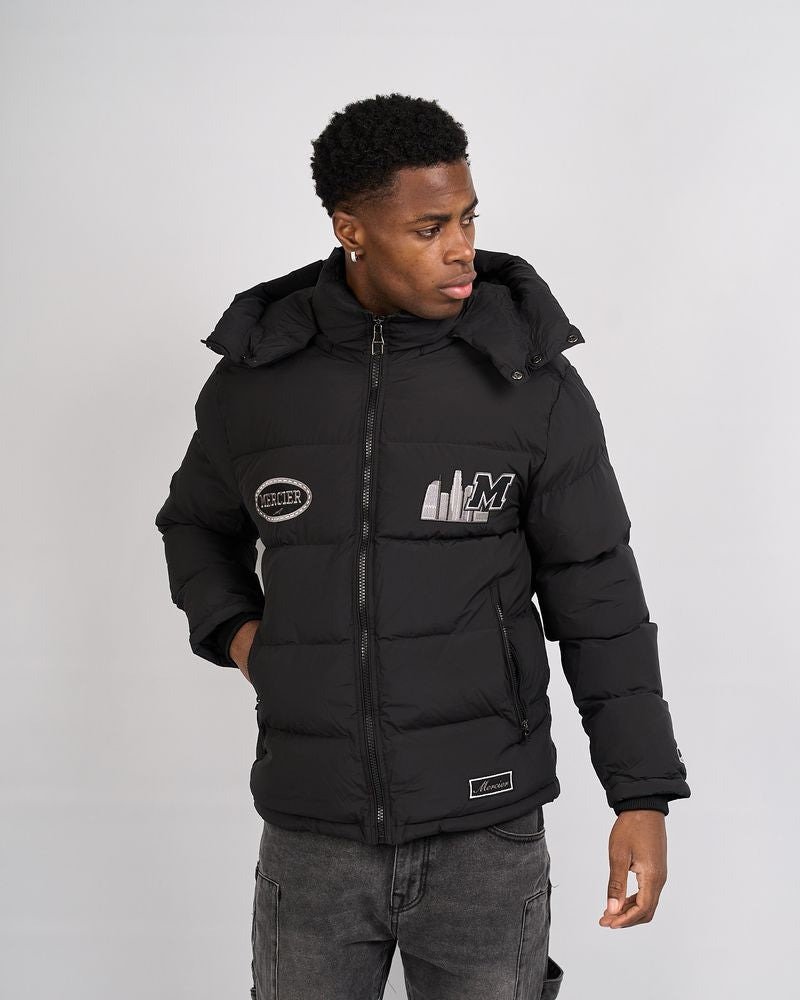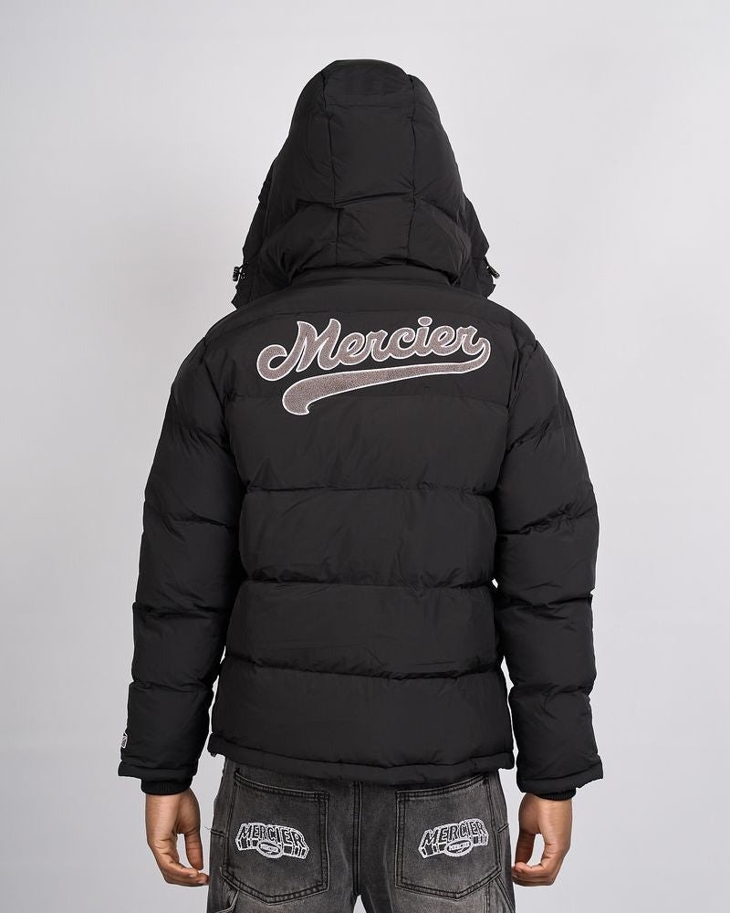Black Signature Puffer Mercier Jacket Branded Press Stud Chest Pockets 2 Way Entry Main Body Pockets High Density Mercier Embroidery on